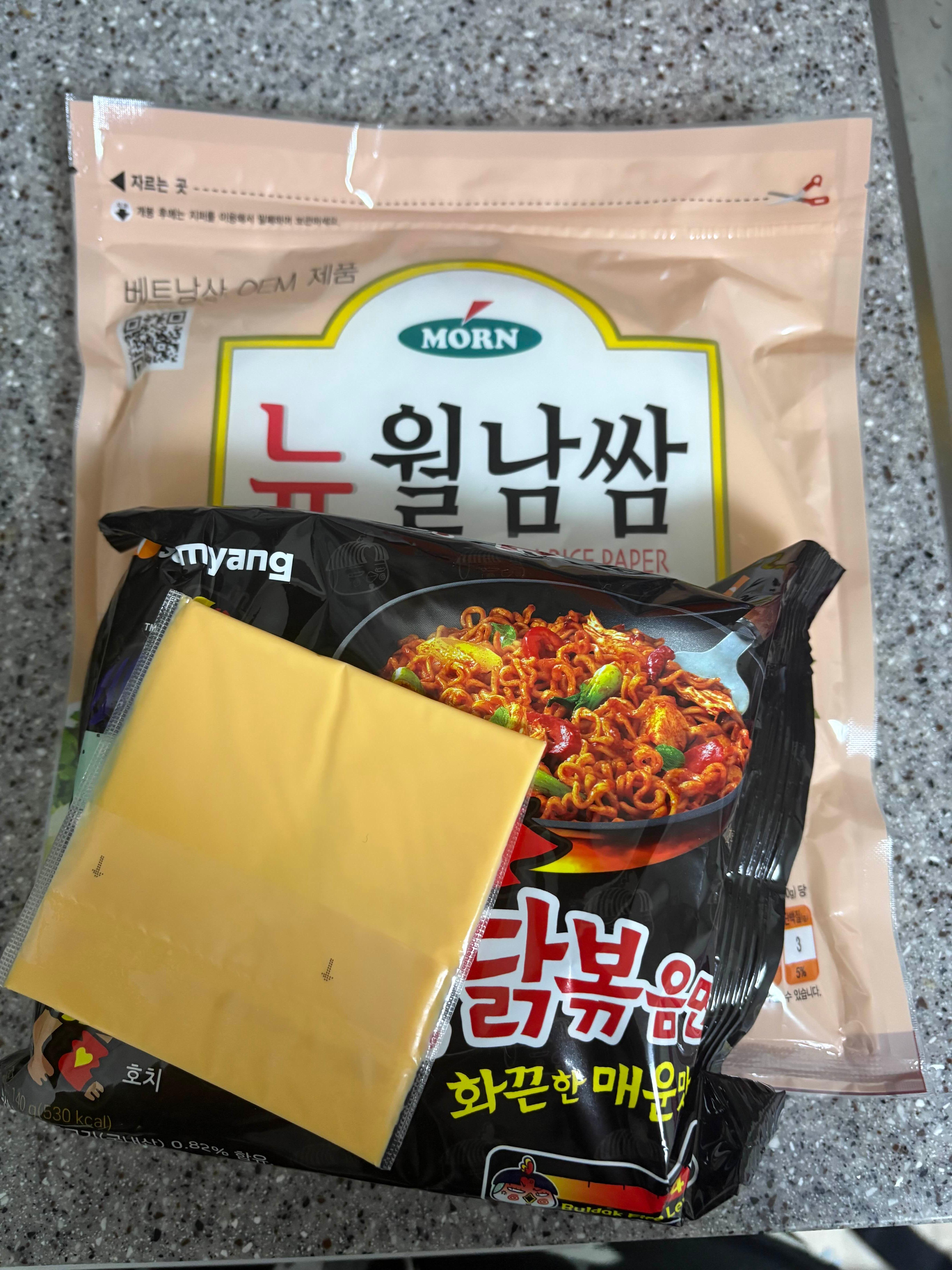 불닭볶음면, 슬라이스 치즈, 라이스페이퍼, 마요네즈를 준비합니다