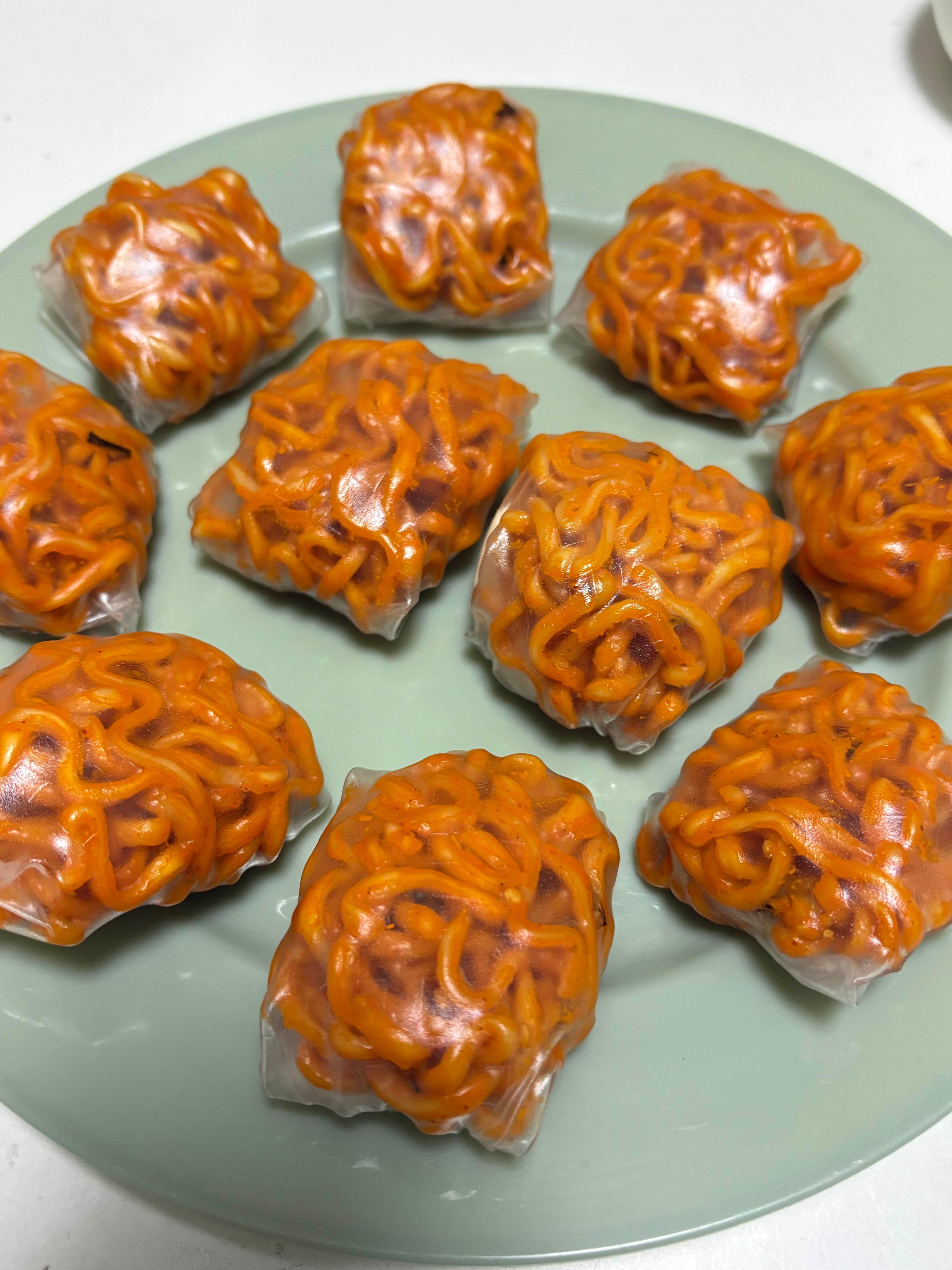 라이스페이퍼 위에 불닭면을 올려 말아 줍니다